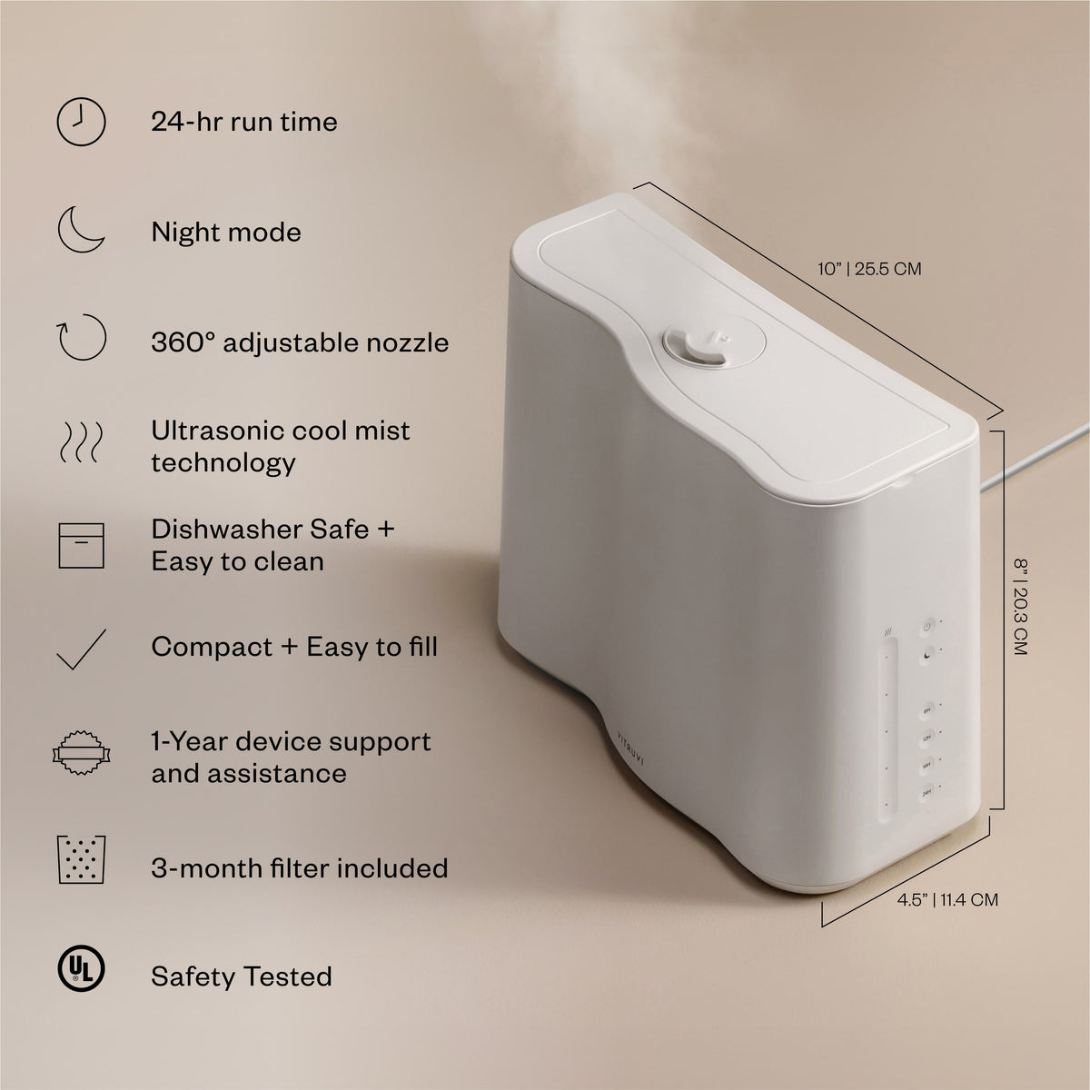 Elevate your sleep and beauty routine with the Cloud Humidifier. Whisper-quiet and designed for optimal performance, it provides a continuous cool mist that hydrates your skin and hair, promoting a dewy complexion and silky locks. With settings ranging from 8 to 24 hours and a light-free night mode, it ensures undisturbed, restful sleep. Safe for kids and easy to clean with a dishwasher-safe water bucket, the Cloud Humidifier is the perfect addition to your bedroom for enhanced wellness and natural immunity. Its compact, nightstand-friendly design fits seamlessly into any space, humidifying rooms up to 600 sq.-ft.